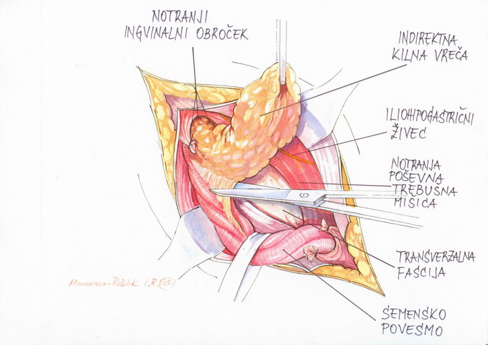 V primeru indirektne kile sprepariramo kilno vrečo globoko do notranjega obročka, tako da se nam ob njem odpre preperitonealni (oz. t. i. Bogrosov) prostor (slika 4).