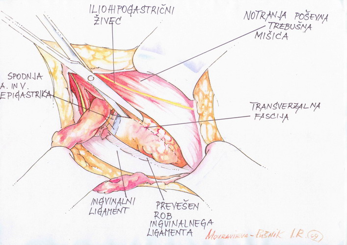 Incidiramo fascijo transverzalis (začnemo s skalpelom ali kutorjem medialno pri pubičnem tuberklu) ter nadaljujemo s kutorjem ali Metzenbaumovimi topimi škarjami proti notranjemu ingvinalnemu obročku ter se ustavimo pred epigastričnim žiljem. Le-to redko poteka tako, da moti kasnejšo hernioplastiko, saj ga lahko odmaknemo dorzalno. Če vendarle moti, ga odreseciramo med ligaturama. Nekateri avtorji svetujejo obratno smer rezanja transverzalne fascije (6). Med prekinitvijo transverzalne fascije se preperitonealno maščevje prične bočiti v operativno polje, lateralno se dorzalno od ingvinalnega ligamenta pokaže Cooperjev ligament (slika 6).