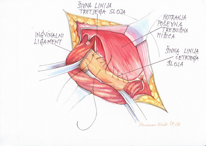 Nato tekoče pošijemo €“ zbližamo prerezano transverzalno fascijo v smeri proti lateralno do notranjega dimeljskega obročka. Na medialni strani šivamo t.i. »belo črto« oz. spodnjo ploskev združene tetive (»conjoined tendon«), ki skrajno medialno in kavdalno predstavlja lateralni rob ovojnice preme trebušne mišice, bolj kranialno skupno tetivo prečne trebušne mišice in notranje poševne trebušne mišice, še bolj lateralno pa postane mišična struktura. Na lateralni strani predstavlja rob šivne linije iliopubični trakt.