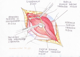 Po zarezanju fascije zunanje poševne trebušne mišice identificiramo ilioingvinalni živec, ki ga največkrat uzremo takoj, ko poteka tik pod fascijo vzdolž semenskega povesma (slika 2). Brez nepotrebnega preprijemanja živca le-tega s škarjami ali topo odprepariramo od podlage ter odmaknemo lateralno, medialno od njega zapnemo na fascijo (ingvinalni ligament) pean ter živec do konca posega tako retiniramo v položaju.