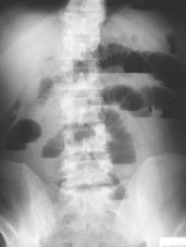 41-letni moški je bil sprejet na naš oddelek z razvijajočo se sliko ileusa tankega črevesa. V preteklosti je že bil operiran zaradi levostranske dimeljske kile, imel pa je tudi reponibilno desnostransko dimeljsko kilo ter čakal na operacijo. SH levo predoperativno ni bila klinično izražena, zato nanjo nismo pomislili. Rentgenska slika abdomna stoje na prazno je potrdila ileus tankega črevesa (Sl. 4), ki ga s konzervativnimi ukrepi nismo uspeli razrešiti, zato je bil urgentno operiran. Pri operaciji smo našli v levostransko SH vkleščeno tanko črevo. Narejena je bila dezinkarceracija vijuge ter notranja evakuacija črevesne vsebine. Vijuga ni bila vitalno ogrožena. V pooperativnem poteku je prišlo do paralitičnega ileusa, ob konzervativnih ukrepih se je peristaltika po petih dneh vzpostavila.
